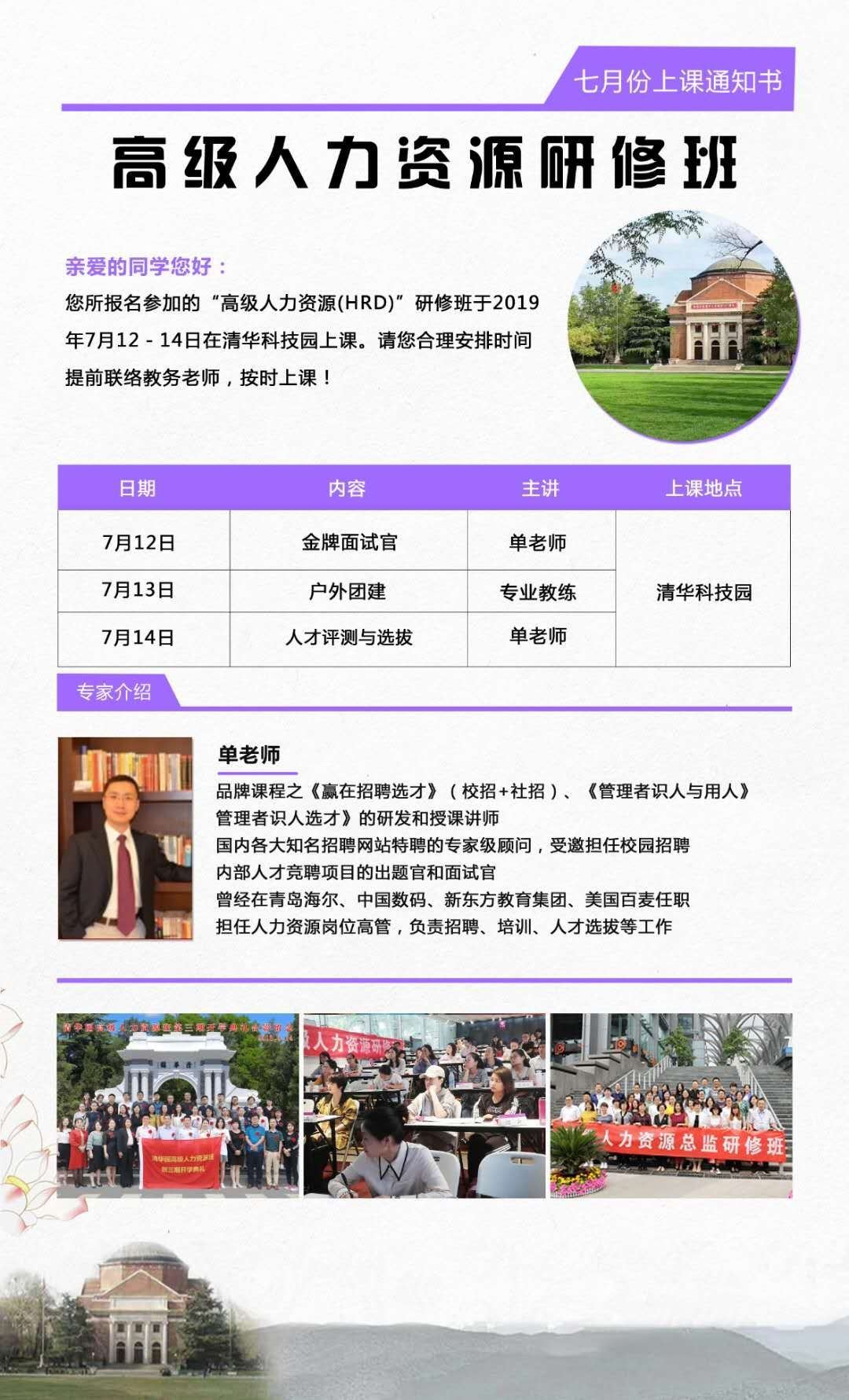 您所报名参加的” 高级人力资源研修班” 于2019年7月12日-14日在清华科技园上课。请您合理安排时间,提前联络教务老师,按时上课!