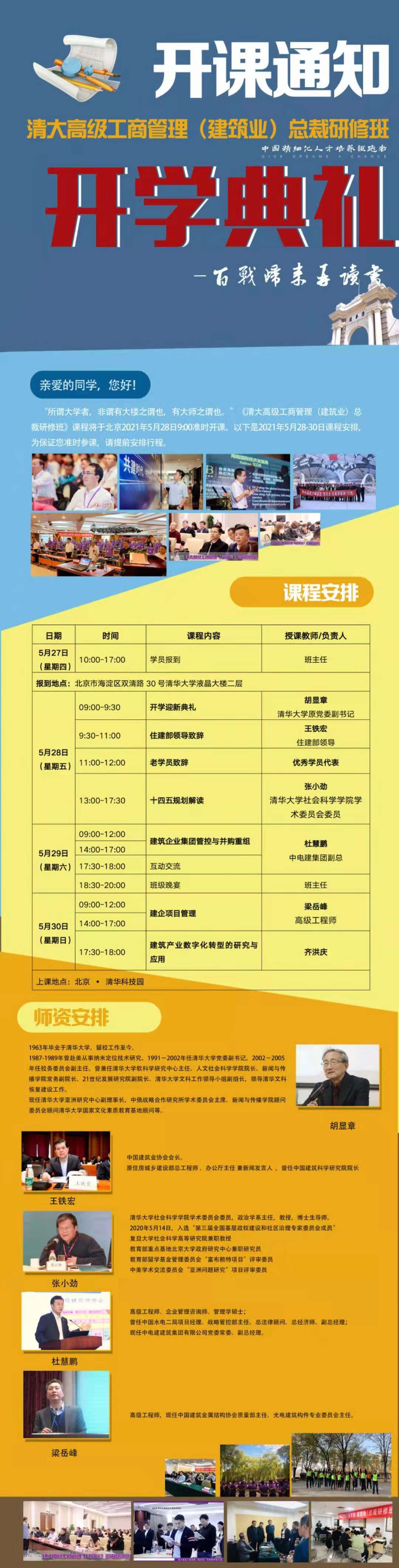 “所谓大学者,非谓有大楼之谓也,有大师之谓也。”《清大高级工商管理(建筑业)总裁研修班》课程将于北京2021年5月28日9:00准时开课。