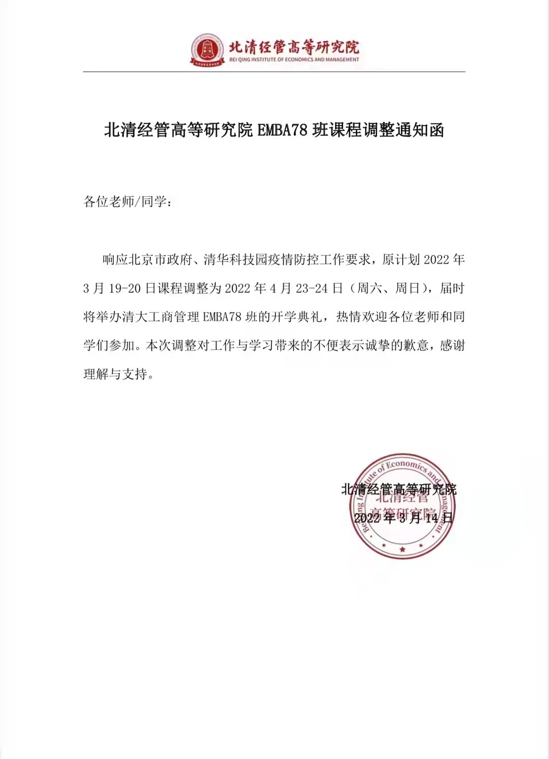 各位老师同学:为响应北京市政府,清华科技园疫情防控工作要求,原计划3月19-20日课程,调整为:4月23-24日,届时将举力清大工商管理EMBA78班的开学典礼热情欢迎各位老师和同学位参加。本次调整带来的不便,表示诚挚的歉意,感谢理解与支持。